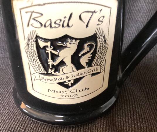 Stoneware beer mugs created for the club members of the Basil T’s Brew Pub. Two-tone glaze with Green and tan and Black and Green. Both with the Pubs shield. These limited production mugs as sought after by breweriana collectors. Many pubs from that time period have since closed, making their them scarce. Sale is for both mugs. Basil T’s was located in Red Bank NJ.