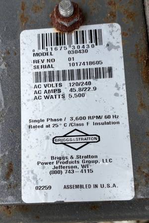Runs great, well maintained portable generator. New carburetor. Briggs & Stratton engine. 8250 starting watts. 5500 watts.