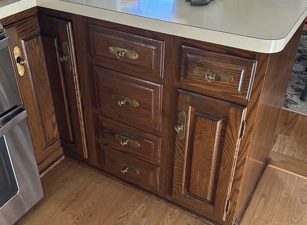 Solidnoak kitchen cabinets and pantry. 30 inch cabinets. Solid maple shelves . Excellent condition. Full kitchen . $2,500.
