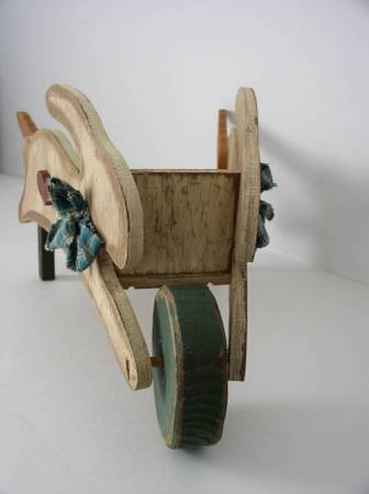 Two 'carrot' handles in rear, front wooden wheel moves side to side